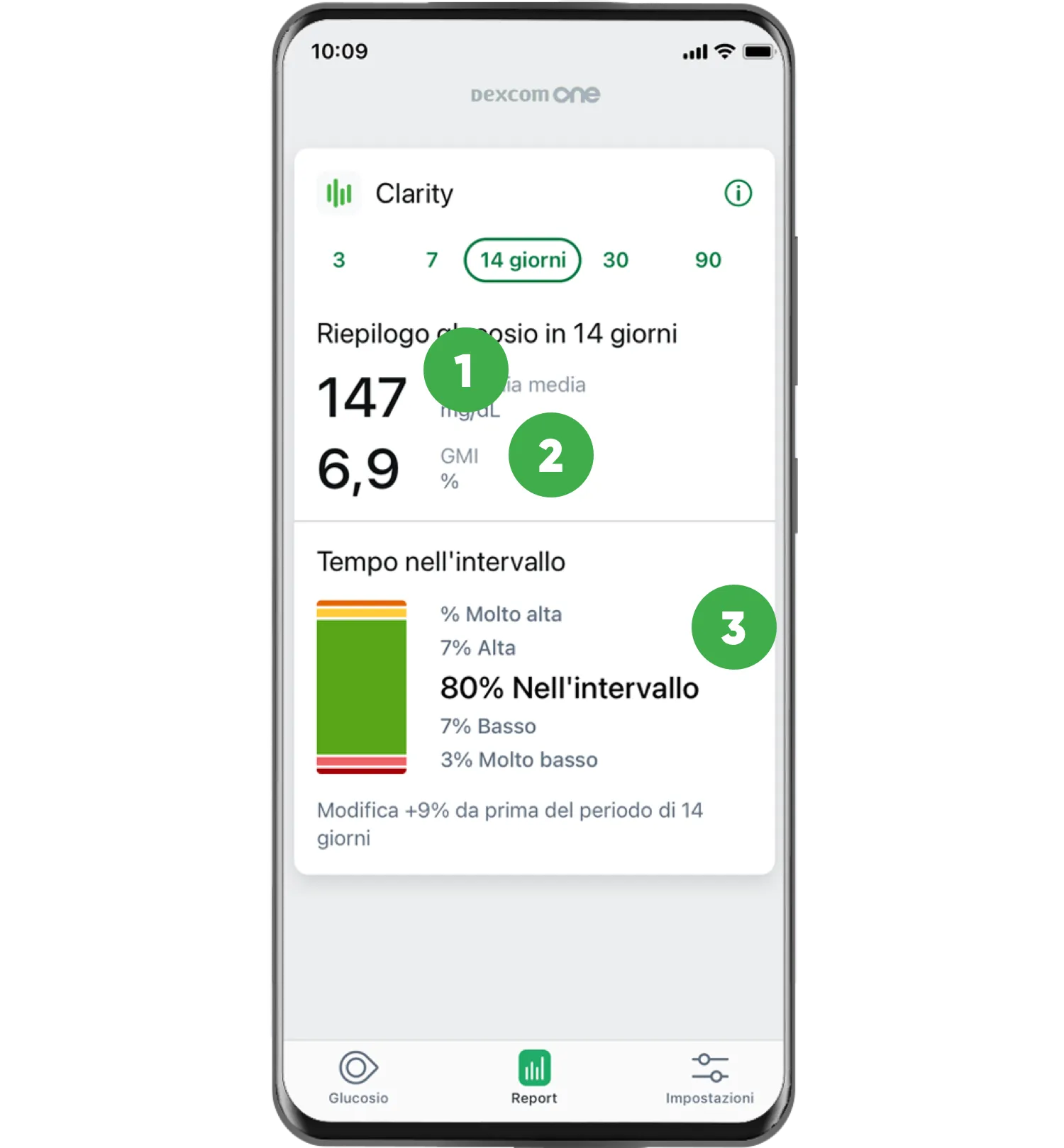 percentuale di tempo passato negli intervalli di glucosio alto, ottimale e basso.