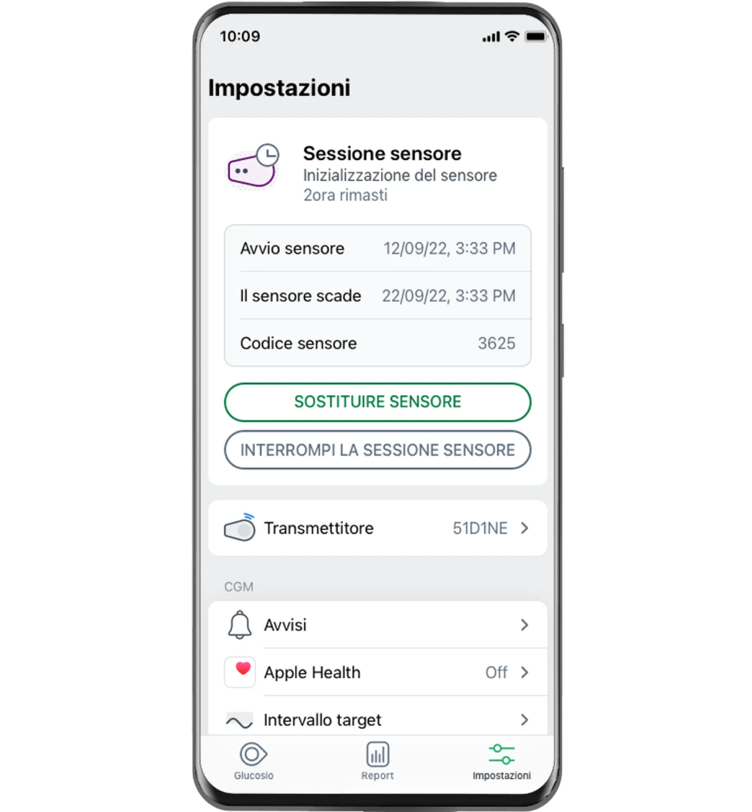 Nella Schermata Impostazioni puoi gestire facilmente il tuo sensore e trasmettitore, attivare e personalizzare i tuoi avvisi e collegare la tua App Salute (solo per versione iOS).